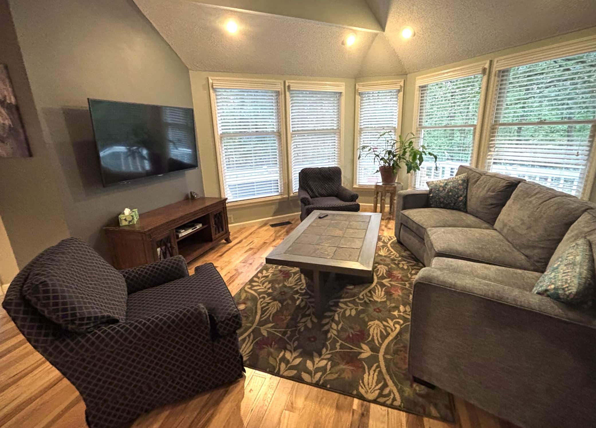 Tucked away at the end of a long gravel drive, this cozy 3 bedroom/2bath retreat offers peace and privacy in a wooded setting. With 2 queen bedrooms (one with balcony), a 2 twin bedroom, a loft and two bathrooms with showers, there’s plenty of space for family or friends to unwind. Screened in sunroom and a beautiful deck to enjoy the outdoors in the country woods. A comfy loft is perfect for lounging with a book or game after a day at TIEC, just 5 minutes away. Â